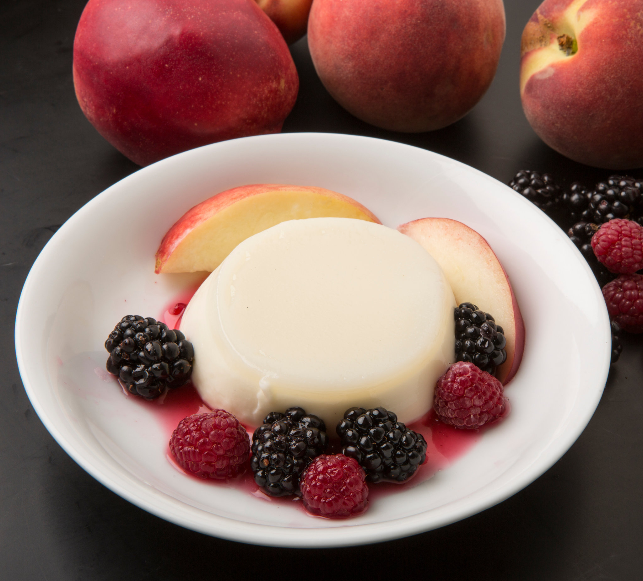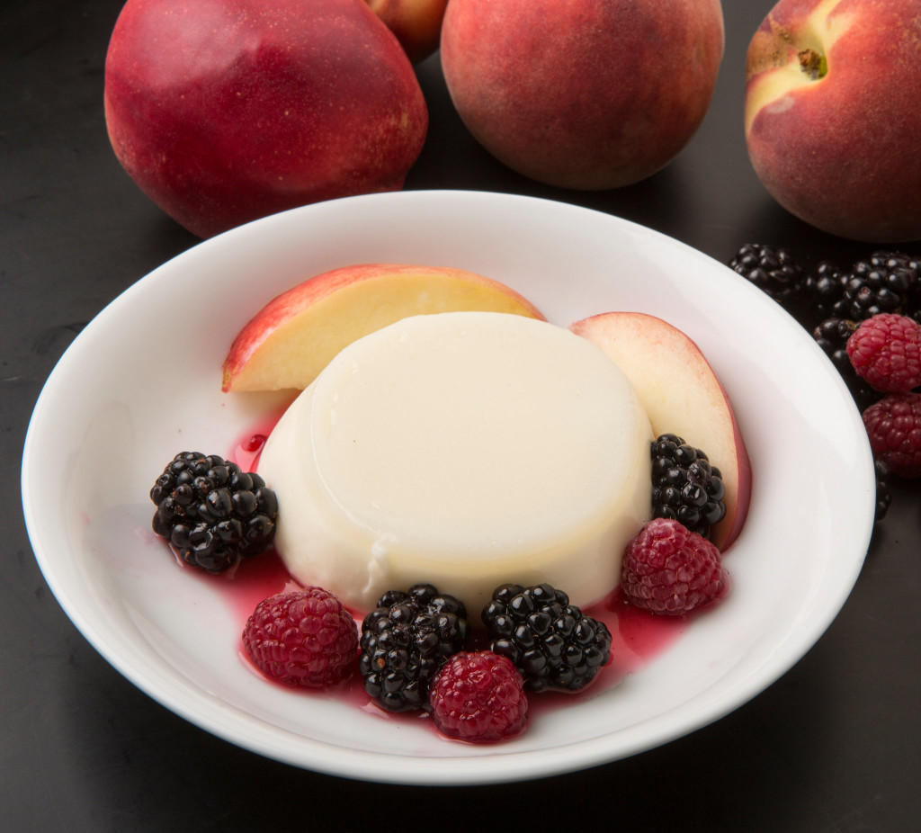 3. Put berries in a bowl and sprinkle with the sugar and grated ginger. Mix gently and macerate 10 minutes. Add slices of nectarine or peach, if desired. To serve, run a knife around edge of ramekin, then invert ramekin over dish. Shake gently to unmold. Surround panna cotta with fruit, or serve in ramekin with fruit on top.