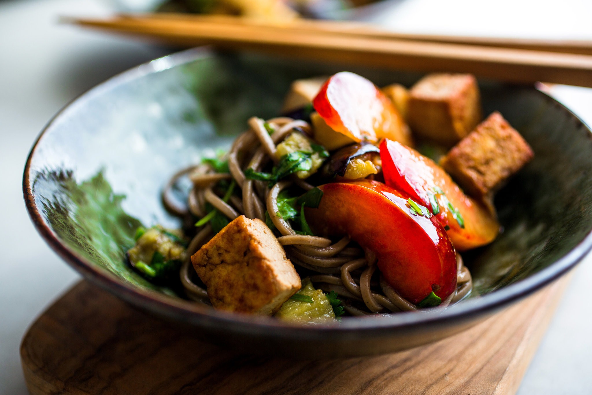 - Heat a wok or a large heavy frying pan over high heat until a drop of water evaporates within a few seconds when added to the pan. Add 1 tablespoon of the sunflower oil and the tofu. Let sit in the pan to sear for 30 seconds, then stir-fry until lightly browned. Add 1 teaspoon of the soy sauce, toss together, then remove from the heat and add to the noodles. Add the roasted eggplant and the minced chiles, the plums or pluots and all of the chopped herbs if serving right away, half of them if serving later.