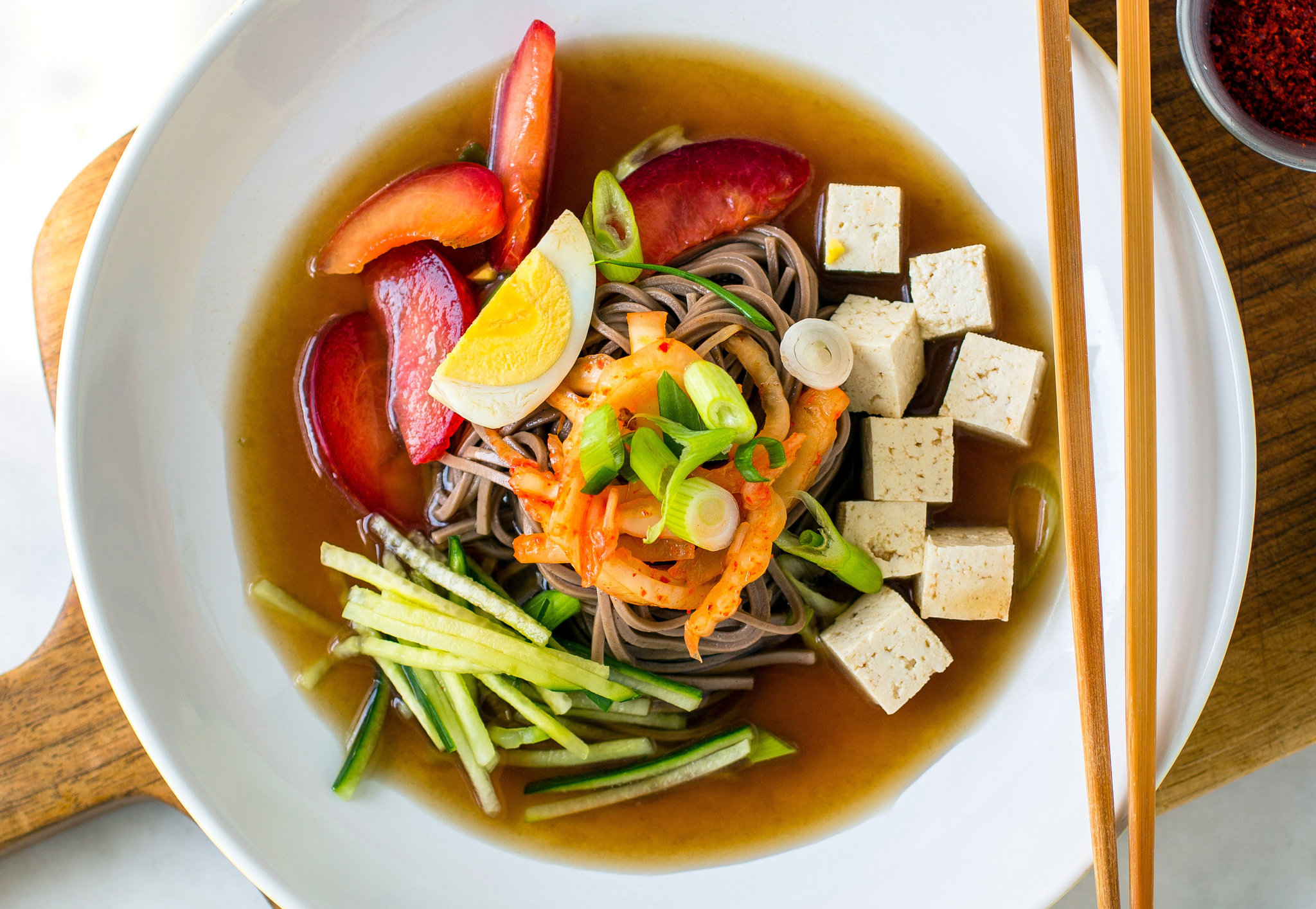 This recipe is inspired by the signature Korean summer noodle dish, naeng myung. The traditional dish is made with a strong beef broth. I’m using a vegetarian broth I make with dried mushrooms and kelp, adapted from a recipe in Deborah Madison’s “Vegetarian Cooking for Everybody.” You could also use chicken stock. The dish can include chicken or meat, or it can be vegetarian, as this version is, with tofu standing in for chicken. It can also be vegan if you omit the boiled eggs. Make the broth a day ahead so that it will be nice and cold.