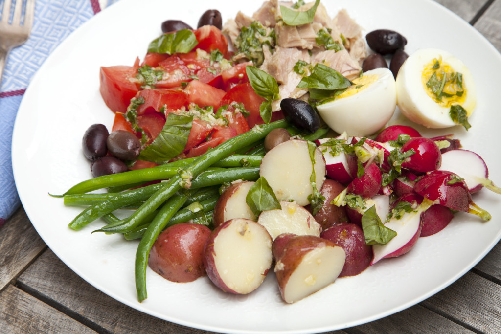 - On a large platter or four individual plates, arrange potatoes and haricots verts, radishes or cucumbers, tomatoes and tuna. Scatter olives over the top and drizzle with remaining vinaigrette. Serve garnished with freshly ground black pepper, flaky sea salt and torn basil leaves.