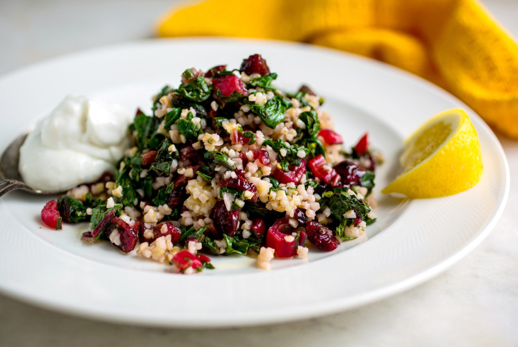 - Combine the bulgur, chopped chard, chard stems, chopped tarragon and mint, za’atar, allspice and barberries in a large bowl. Whisk together the lemon juice, salt and pepper to taste, and olive oil. Toss with the bulgur mixture. Transfer to a platter or a wide salad bowl.