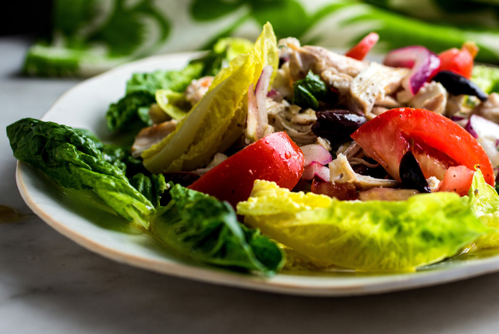 A small amount of seared and roasted chicken breast transforms this tomato-centric Greek salad into something substantial enough to eat as a main dish for lunch or a light supper.