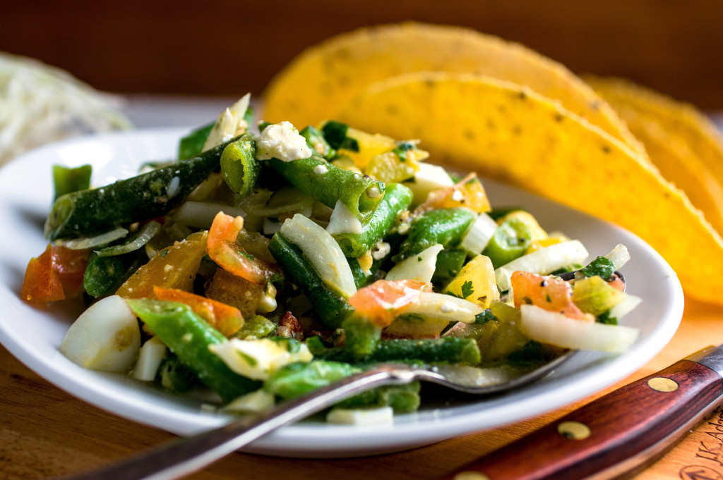 - Steam the green beans or blanch in salted boiling water for 4 minutes. Transfer to a bowl of cold water, then drain and dry on paper towels or a clean kitchen towel. Cut into 3/4-inch lengths. Toss with the chiles, onion, tomatoes, cilantro, salt, pepper, cheese, and chopped hard-boiled eggs.
