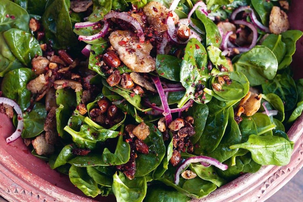 - When ready to serve, toss spinach leaves with pita mix in a large mixing bowl. Add dates and red onion, remaining 1 tablespoon olive oil, the lemon juice and another pinch of salt. Taste for seasoning and serve immediately.