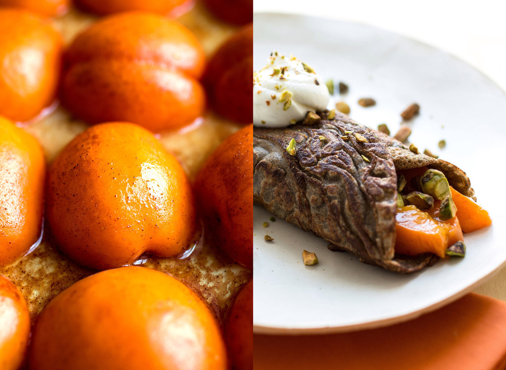 Apricots are delicious in both sweet and savory dishes. The flavor will deepen with cooking. Roasting apricots intensifies the flavor, and the apricots give up some delicious juice. It blends with the small amount of butter and honey here, and you can use it as a sauce. This dish offers a combination of earthy/nutty from the crepes and sweet and tangy from the apricots.