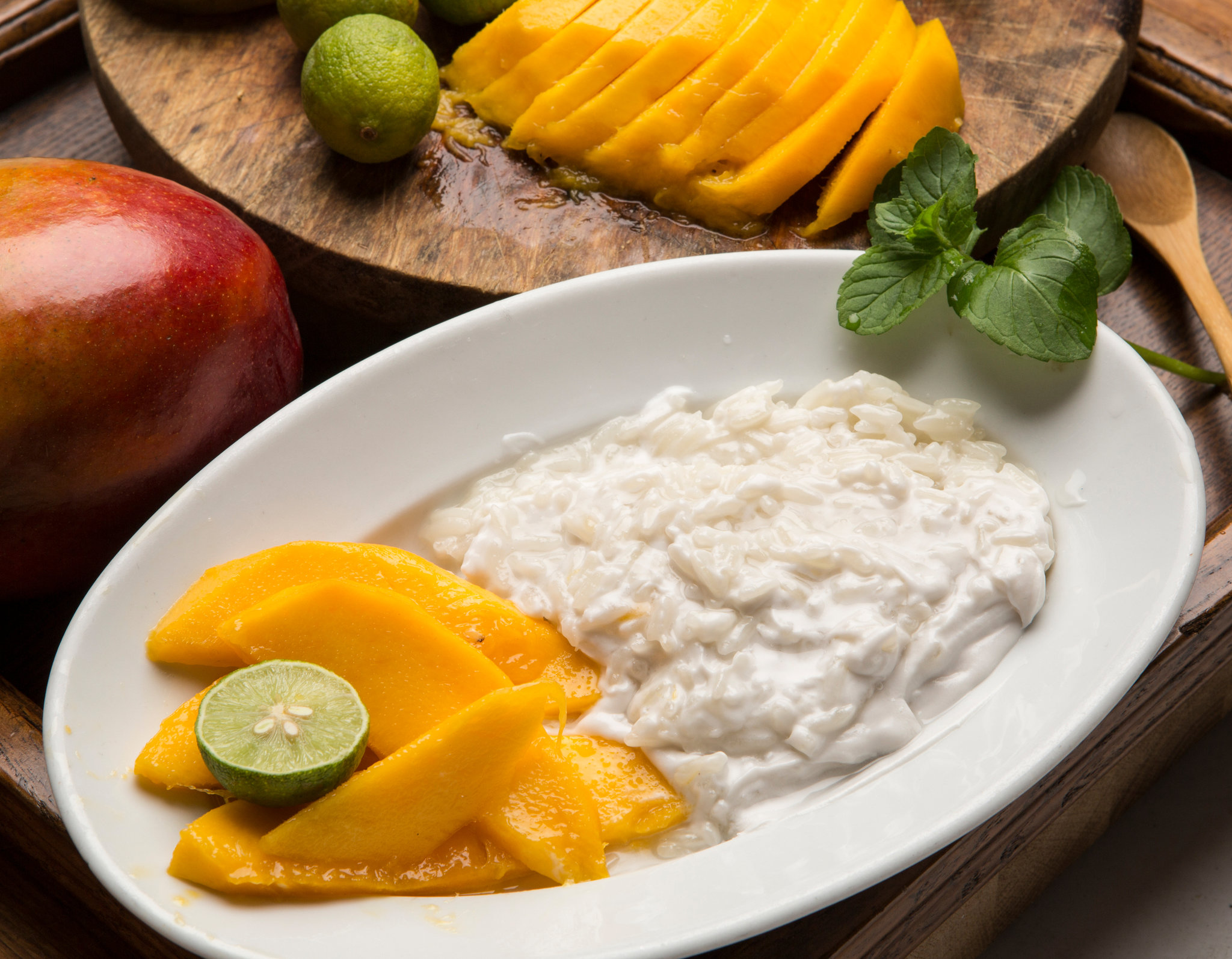 - Put warm rice in a serving bowl. Pour coconut milk mixture over rice and stir well. Leave for 10 minutes to let absorb, then stir in coconut cream. Serve warm or at room temperature with mango slices.