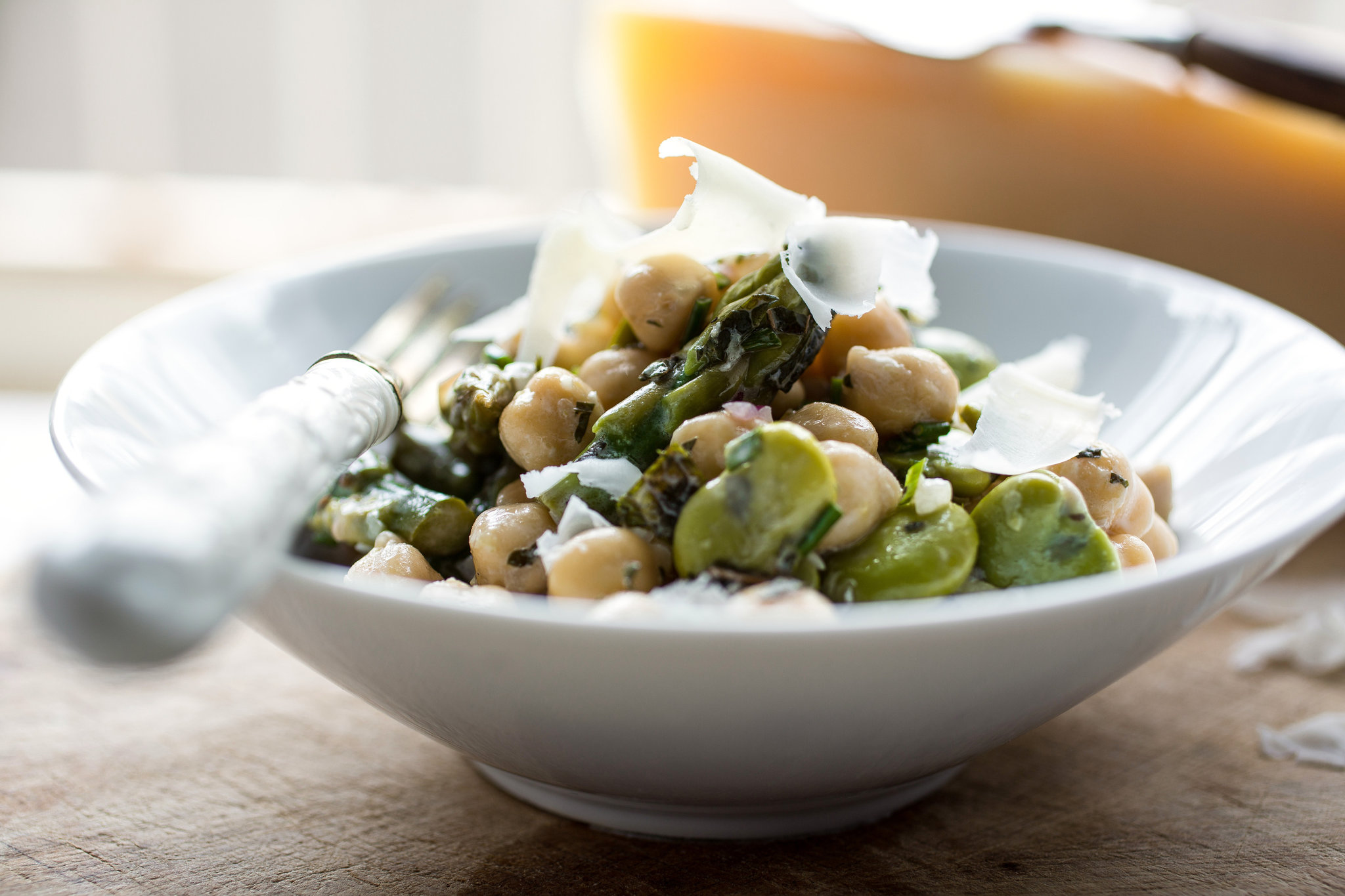 - Blanch and skin the fava beans and place them in a bowl. Use the blanching water to blanch the asparagus, or steam the asparagus if you prefer. If blanching, bring the water in the pot to a boil, salt generously and add the asparagus spears. Blanch 1 to 4 minutes, depending on how thick the asparagus is; fat spears (recommended) will take up to 4 minutes, but thin ones are ready in 1 minute. You can steam the asparagus over 1 inch boiling water for the same amount of time if you prefer. Transfer the lightly cooked asparagus to a bowl of cold water, then drain and dry on paper towels. Cut into 1-inch lengths. Add to the bowl with the fava beans. Add the herbs, and the chickpeas if using.