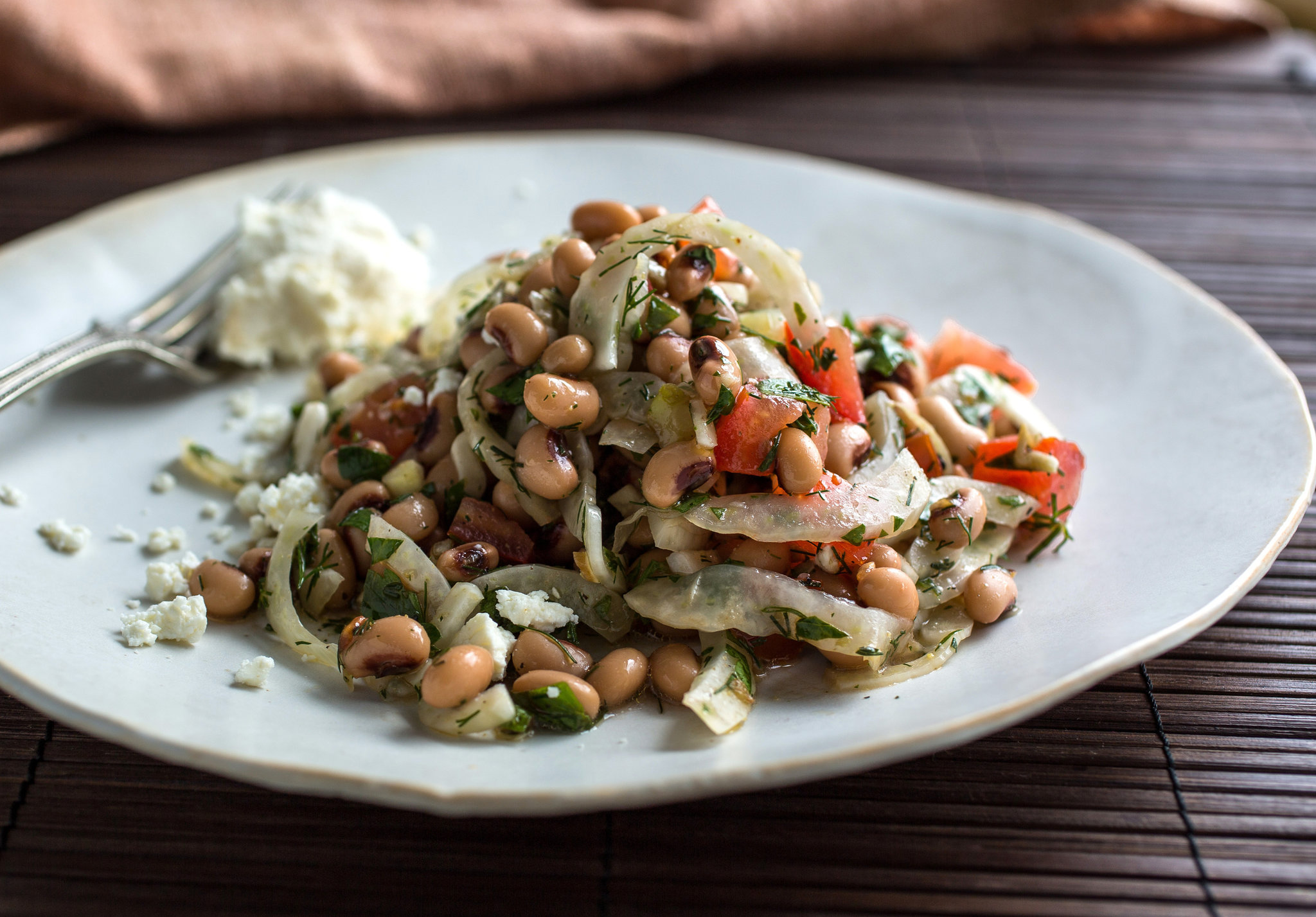 This salad is inspired by a Greek recipe that calls for lots of herb fennel. I couldn’t find herb fennel, so I added a thinly sliced fennel bulb to the mix. Along with its refreshing flavor, the fennel bulb contributes a delightful contrasting crunchy texture. It’s a great salad with or without the tomatoes.