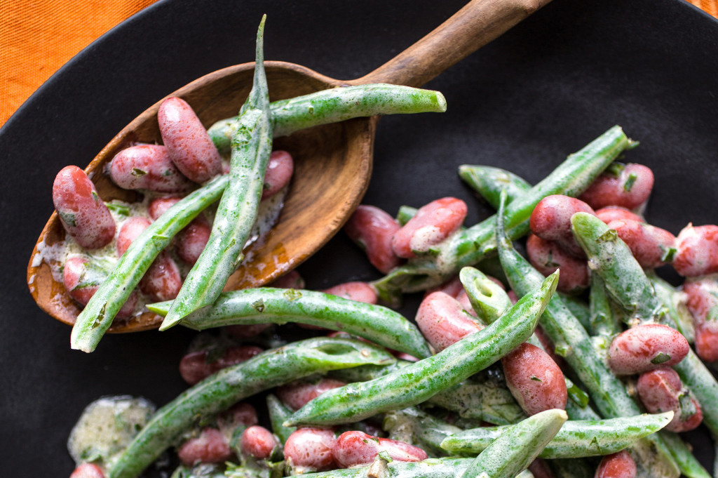 - Toss together the red beans and the herbs. In a small bowl or measuring cup, whisk together the lemon juice, vinegar, mustard, olive oil and 3 tablespoons broth from the beans (or yogurt, if you used canned beans). If you have time, allow the mixture to marinate, in or out of the refrigerator, for 30 minutes before adding the green beans and serving. Add the green beans and toss again just before serving.
