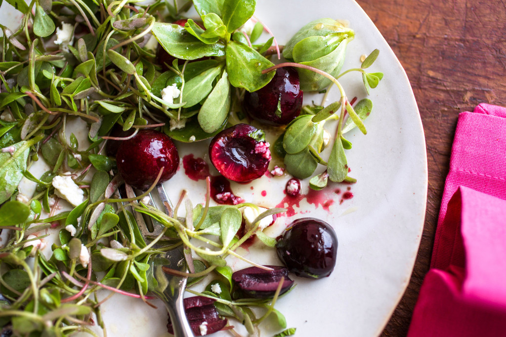 This salad is inspired by one I ate in Greece. I’ve added the cherries and made the olives optional, though I like the contrast of the briny, salty olives against the cherries. Purslane is nutrient-dense, with lots of omega-3s. If you can’t get hold of it, substitute mâche, another high-omega-3 salad green.