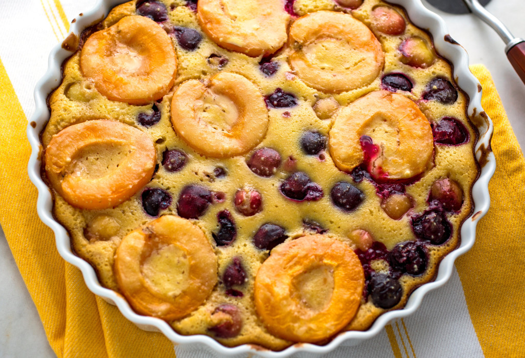 Cherries and apricots are both in season together, and combine nicely in many desserts. I use half almond flour and half all-purpose flour in this clafoutis. Serve it warm or at room temperature, and eat leftovers for breakfast.
