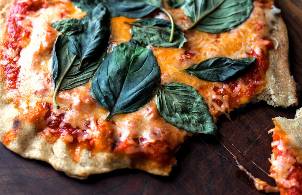 - Make sure that there is still some flour on the peel or baking sheet and flip the dough over so that the uncooked side is now on the bottom. Brush the top lightly with oil, then top with a thin layer of tomato sauce (no more than 1/4 cup) and shreds or slices of mozzarella. Slide the pizza back onto the grill. If using a gas grill, reduce the heat to medium-high. Close the lid and cook for 2 to 3 more minutes, until the bottom is brown. Open the grill and check the pizza; if the cheese hasn’t melted, leave for a few more minutes. If the bottom is getting too dark, move the pizza to a cooler part of the grill and close the top. Use a spatula or tongs to remove the pizza to a cutting board. Arrange fresh basil leaves on top, cut into wedges and serve.