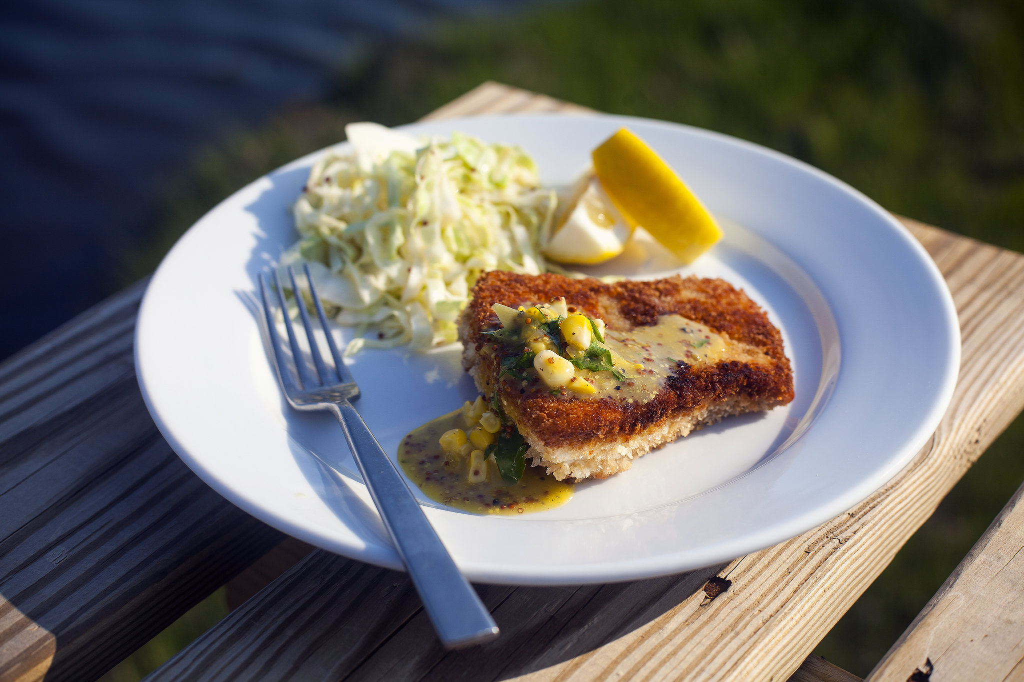 Frying fish at home can be intimidating, not least because it’s messy and can leave the house smelling like a grease pit. Here, though, is a recipe that takes the cooking outside, to a large pan set over a propane hob or, as subsequent testing has borne out, to a large roasting pan filled with oil set over a gas grill. Simply heat the oil until it is very hot but not yet smoking, and add to it very fresh strips of fish dipped in a mixture of flour, salt, pepper and Old Bay, then into egg, and finally into panko, and fry until golden brown on each side, super-crisp, with a moist, tender and perfectly cooked interior. Buy a lot of fish. This is one of those recipes where people tend to want seconds and thirds. Serve with slaw and, if you like, tartar sauce.