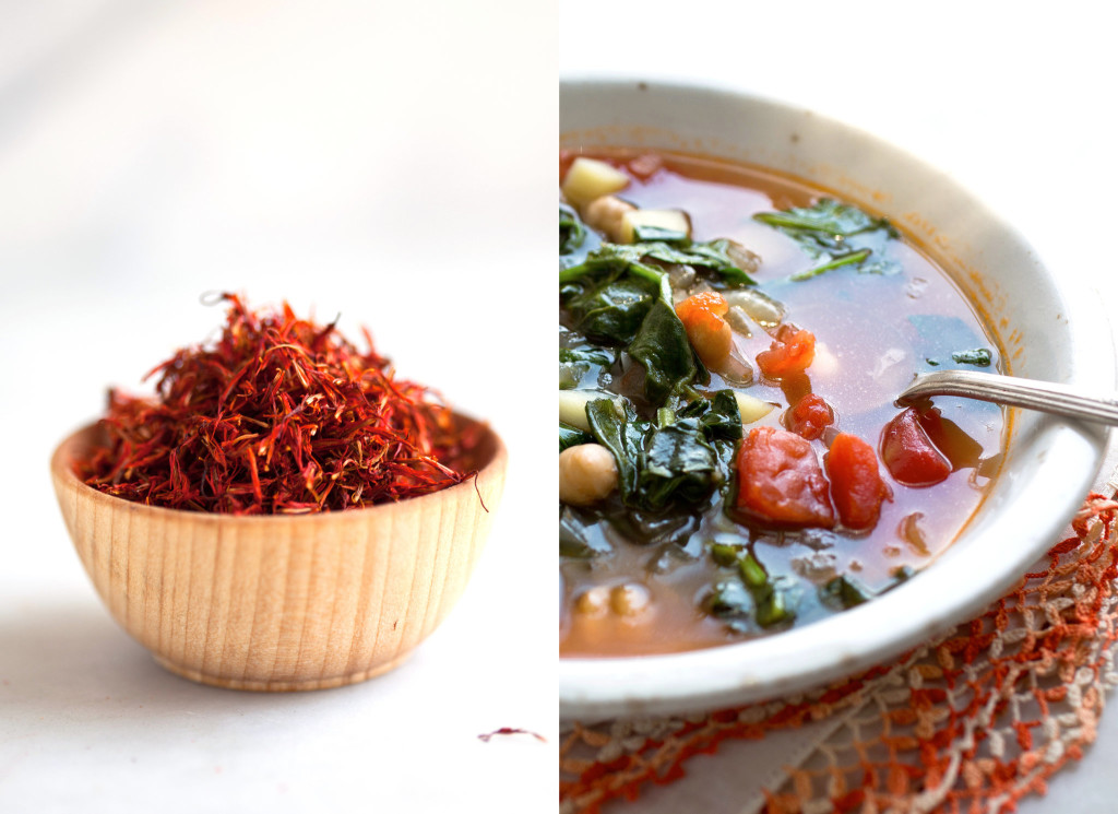 - Stir in the remaining garlic, the saffron and the spinach and simmer another 5 minutes. Add freshly ground pepper, taste and adjust seasoning, and serve.