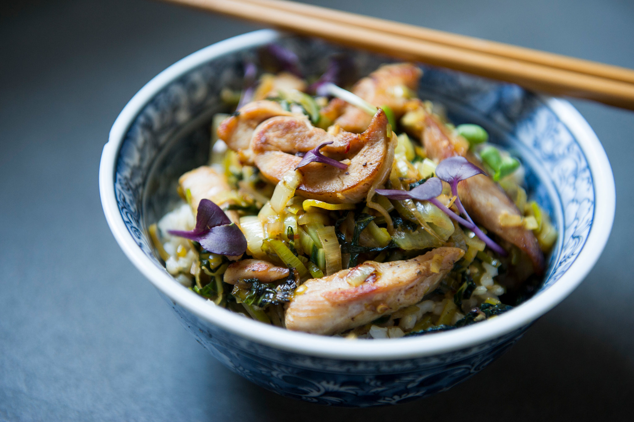 - Add the remaining peanut oil to the skillet. Add the bok choy and cook 1 minute. Stir in the leeks and chili flakes; cook, tossing frequently until bok choy and leeks are tender, about 1 minute. Stir in the marinade and a pinch of salt. Move vegetable mixture to the border of the pan. Add remaining ginger and garlic to center of pan and cook, mashing lightly, until fragrant, about 30 seconds. Return chicken to skillet and combine with ginger, garlic, and vegetables. Serve immediately, over rice.