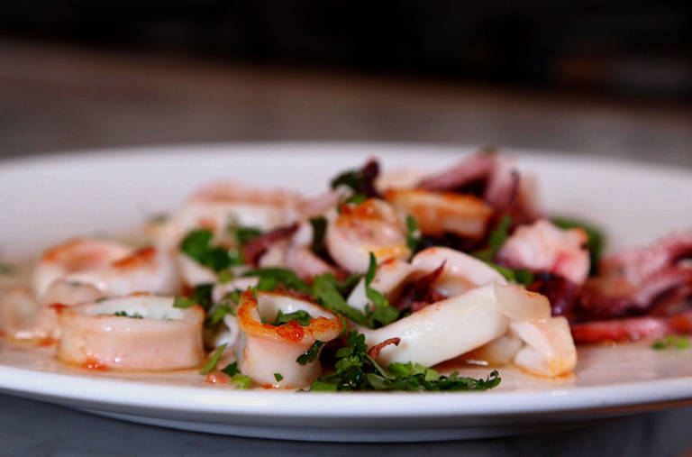 - Top the crusty bread with sliced avocado if you like, and season avocado with salt and lime juice. Serve with the squid.