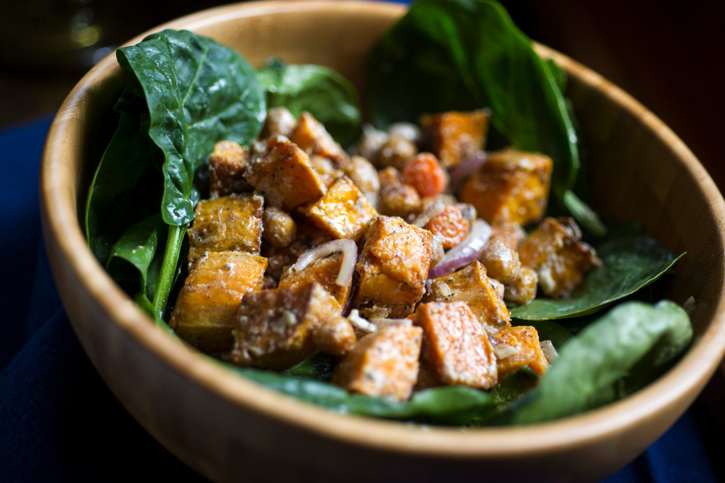 The best main-course salads are precariously balanced things, requiring planning and forethought to come out well. You need to make sure that your mix of vegetables, proteins and starches hits all the requisite flavor and textural notes — sweet, salty, tangy, fresh, crisp, soft and rich. In the end, a main-course salad should feel virtuous and a little decadent, and eminently satisfying. This recipe works on all those levels. It has crunchy, salty chickpeas imbued with spice. There are sweet potatoes and carrots roasted until exquisitely tender. The creamy Greek yogurt dressing spiked with garlic is creamy and rich. And finally, there’s the spinach, which is earthy and fresh.