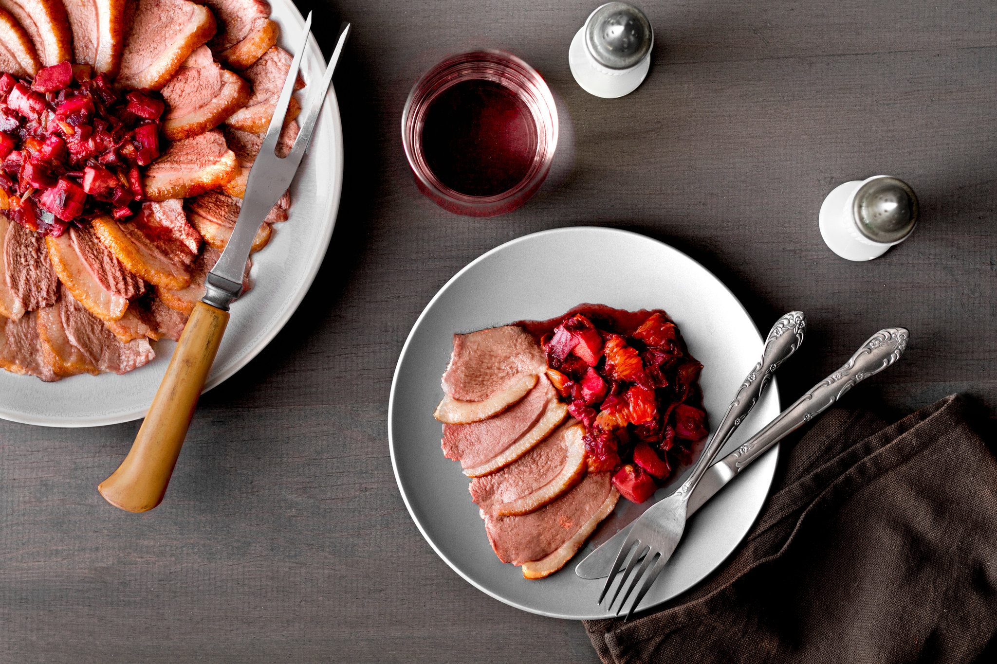 Magret is fattened duck breast. I like to serve it on a round plate, with the slices fanned out and the thick, chutney-like sauce piled in the center. The rhubarb plays off rosy meat and the orange contributes more acid.