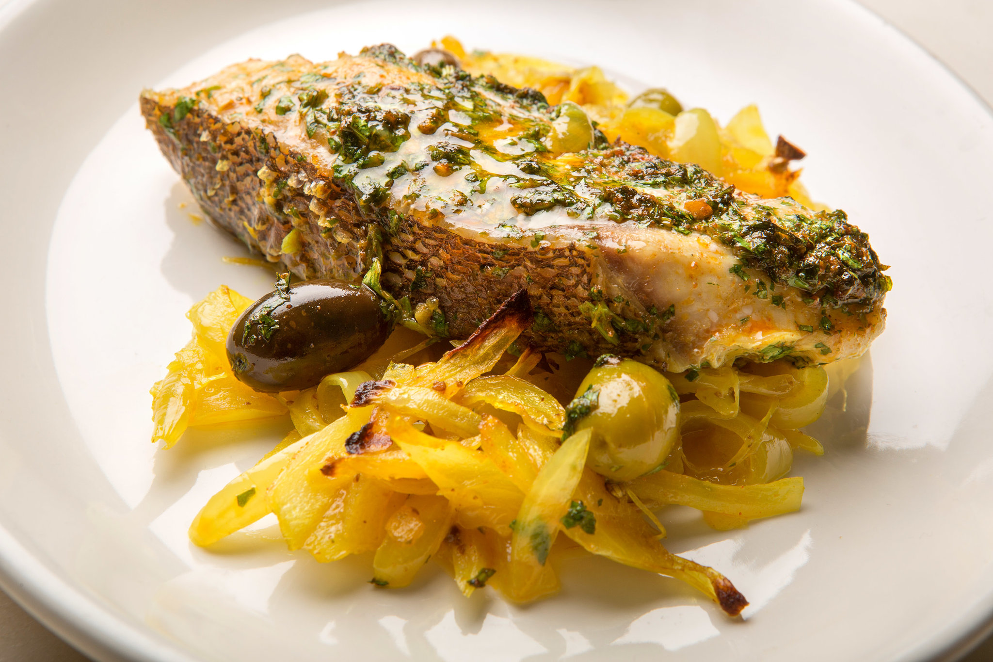 For fish with a spicy North African flavor, marinate firm-fleshed fillets for at least an hour in this traditional mixture of chopped green cilantro, olive oil, garlic, green chiles, paprika and lime juice. Then roast the fish on a bed of savory sliced onions stained yellow with turmeric and seasoned with preserved lemon and olives. Serve with steamed rice or roasted potatoes, and slices of ripe tomato.