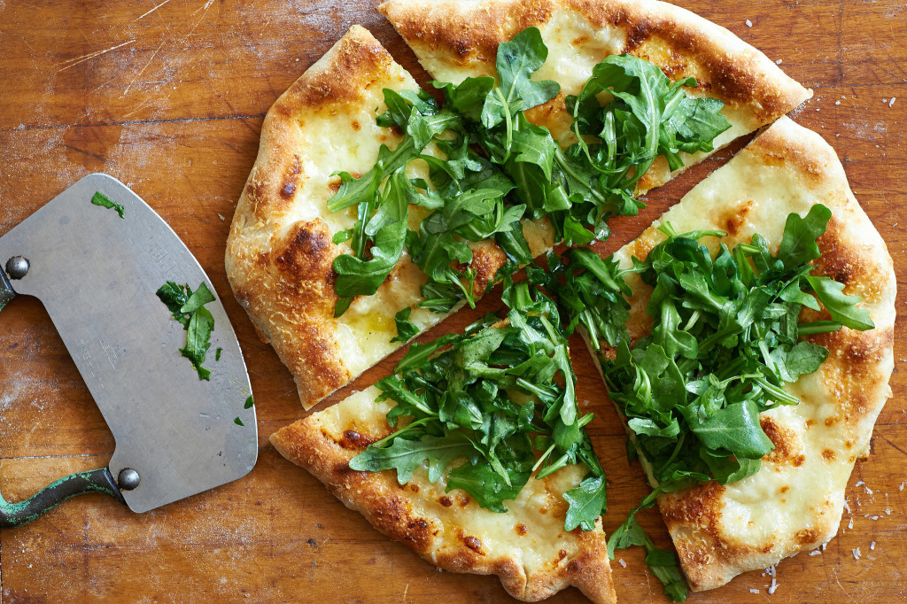 - When the pizza is done, put the dressed greens on top of the pie and serve immediately.