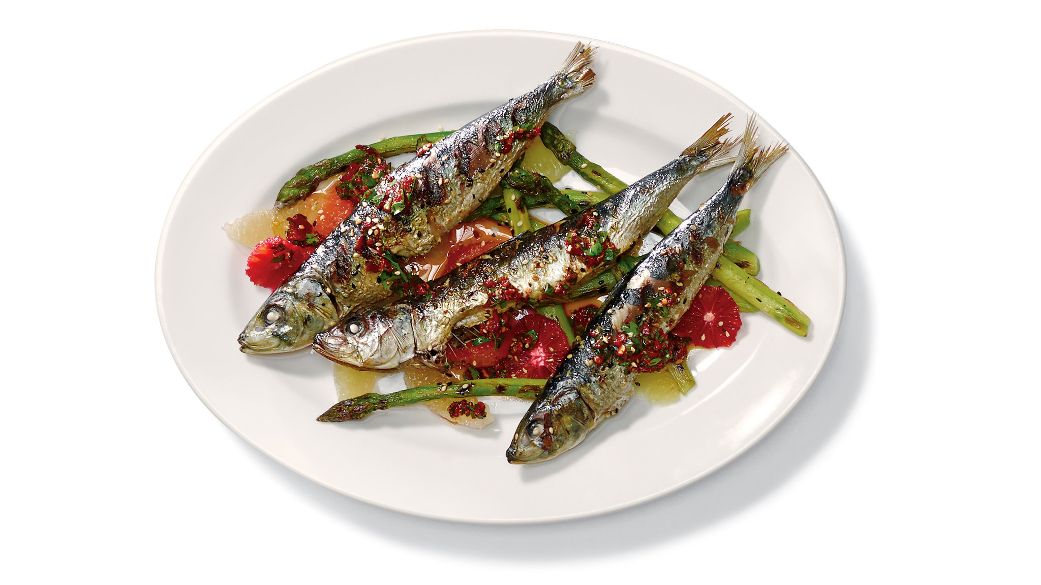 - Spread the citrus on a platter, and lightly season with salt. Place the hot sardines and asparagus on top of the citrus. Spoon over some of the herby chile sauce, and sprinkle the rest of the sesame over the top. Serve the remaining sauce on the side.