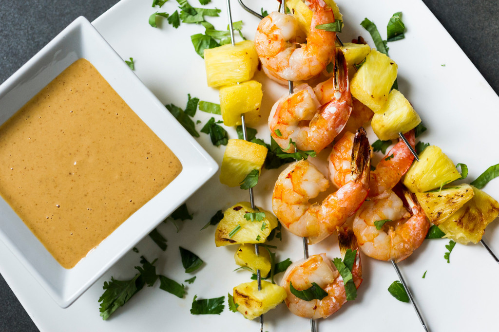 - Roast skewers, turning them halfway through, until shrimp is opaque, about 5 minutes, and pineapple is lightly caramelized, about 10 minutes (use an oven mitt to remove shrimp skewers as they finish cooking but leave the pineapple in for longer). Sprinkle skewers with herbs and serve hot, with peanut sauce for dipping.