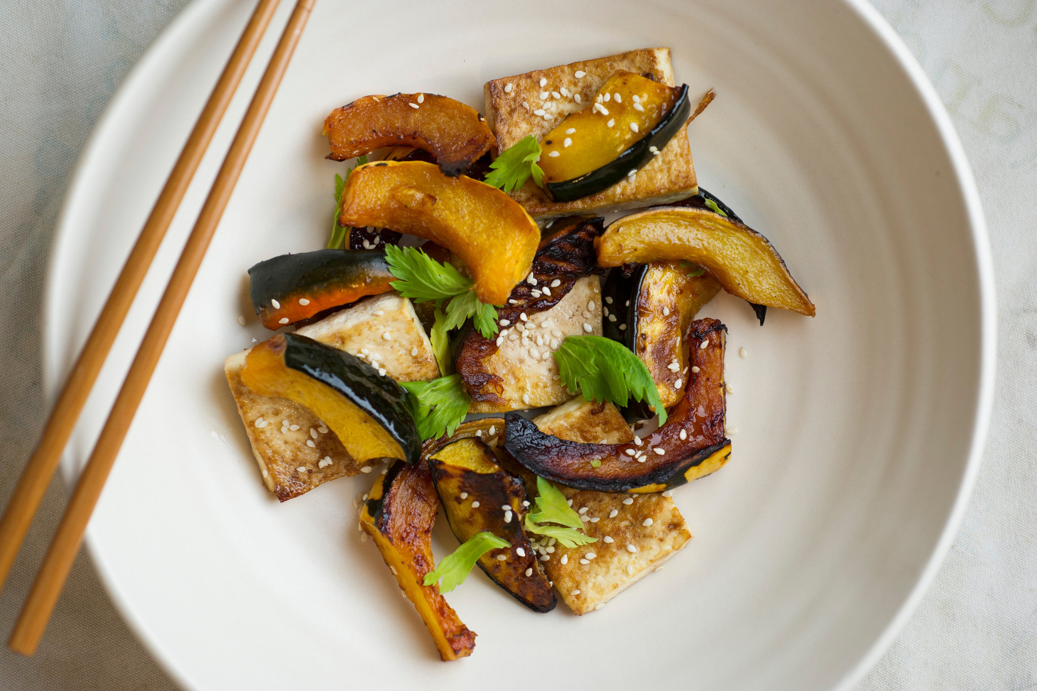 - Adjust the heat to broil and position a rack just below the heating element. Toss tofu with reserved soy mixture and arrange in a single layer on a baking sheet (you can use the same one you used for the squash). Cook until crispy and golden, about 2 minutes per side. Toss hot tofu with squash, sesame seeds and celery leaves, adding more soy sauce if you like.