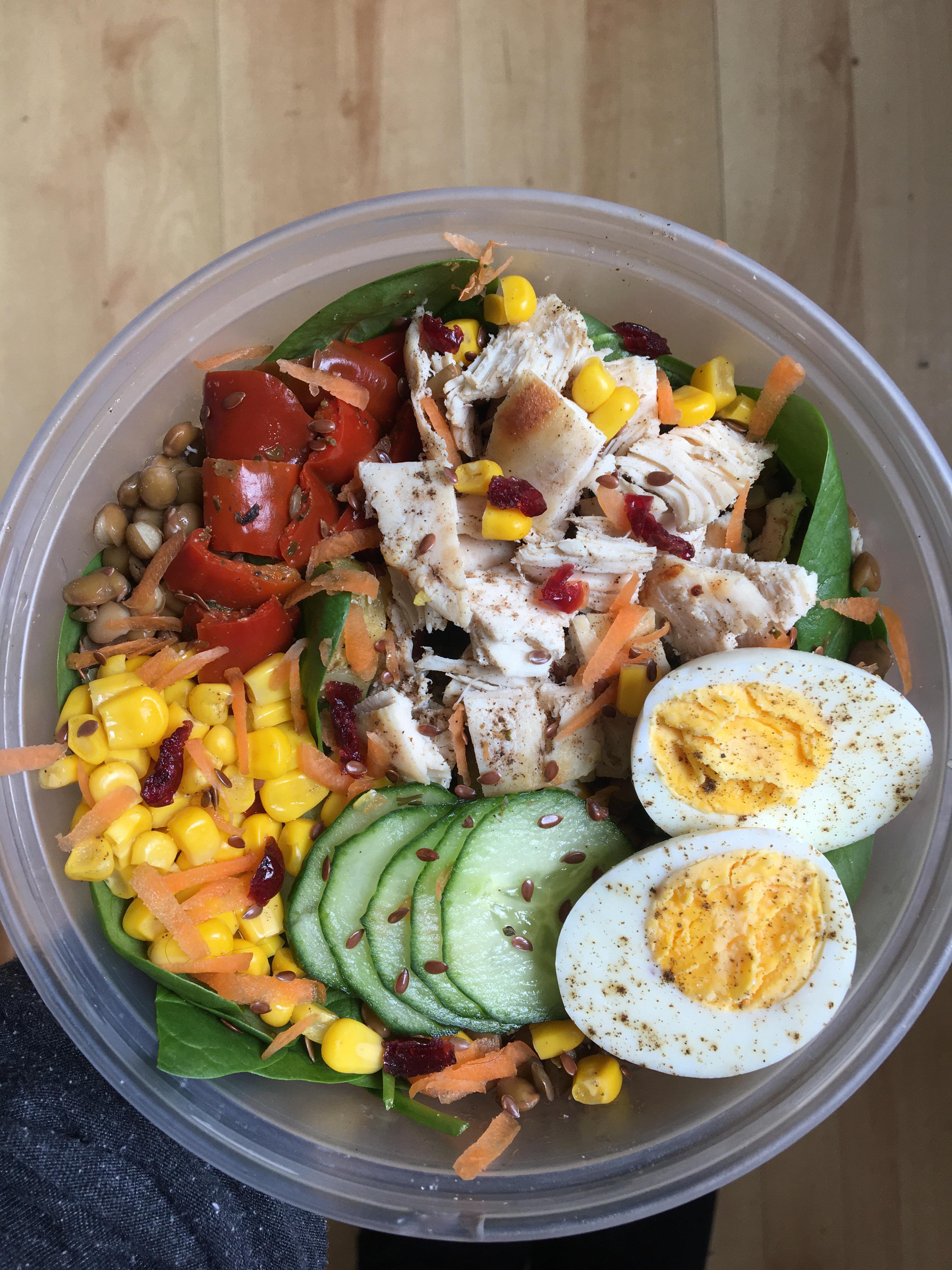 257 cals for a protein packed lunch 😋 grilled chicken, roasted veg, lentils, egg and veggies 🙂 Dining and Cooking