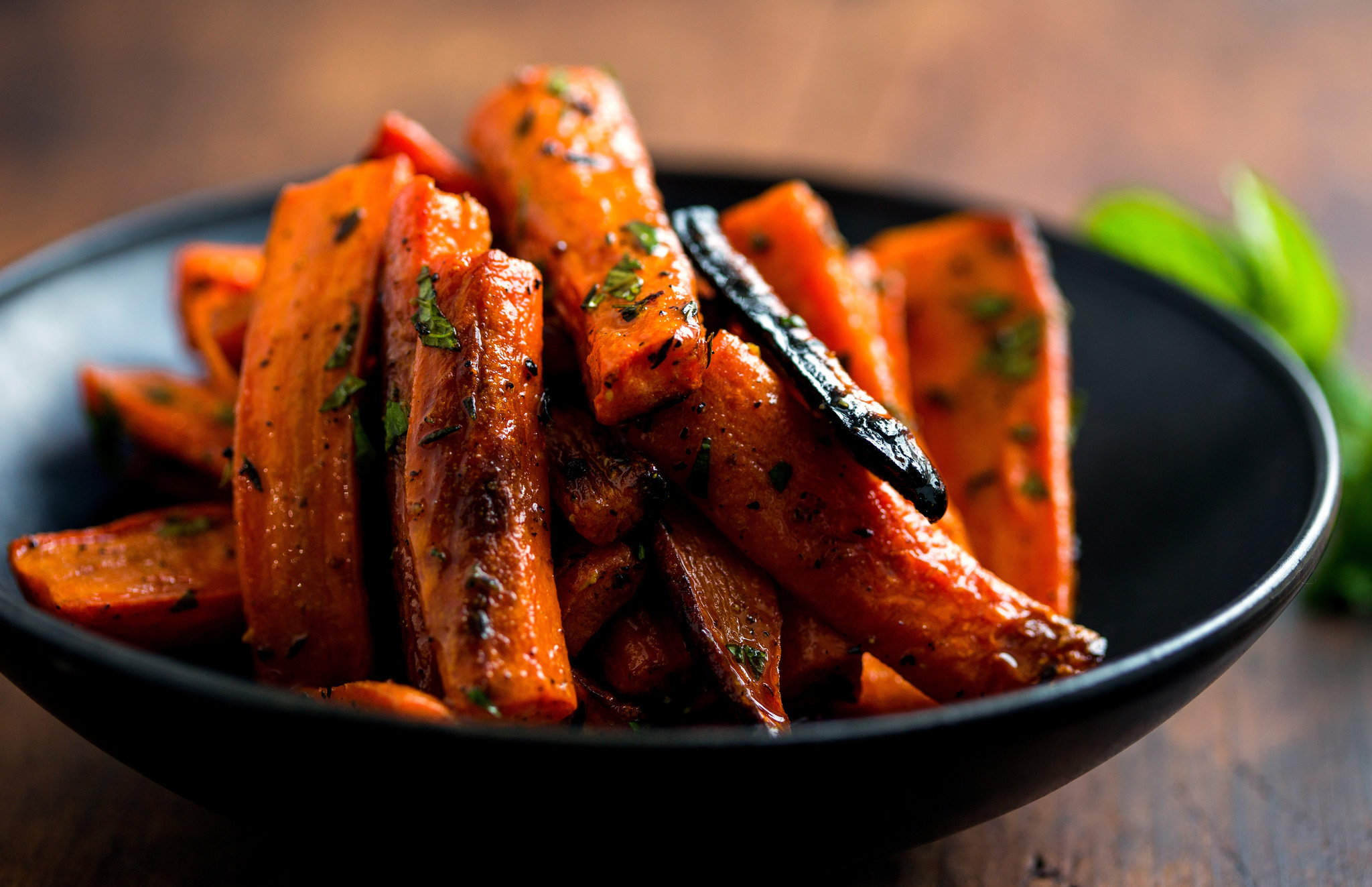 2. Heat a heavy baking sheet in the oven for 3 to 4 minutes. Remove from the oven and place the carrots on it in one layer. Roast for 20 to 25 minutes, stirring the carrots every 10 minutes. They should be slightly caramelized and tender.