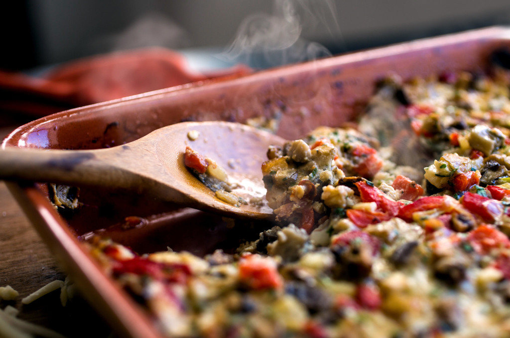 Roasting eggplant requires less oil than frying. It is important to let the roasted eggplant and roasted peppers drain in a strainer, otherwise the gratin will be watery. I recommend roasting the vegetables several hours or a day before you wish to make this. Adding cooked rice to the mixture will result in a firmer gratin.