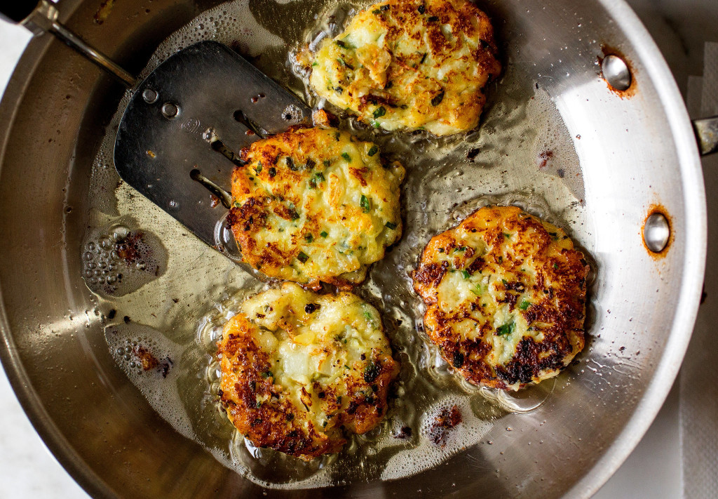 - Begin heating a large heavy skillet over medium heat. Heat the oven to 300 degrees. Add 2 tablespoons of the oil and when it is hot carefully scoop up heaped tablespoons of the potato mixture and use a spoon or spatula to ease them out of the spoon into the pan. Gently flatten the mounds slightly with the back of a spoon or a spatula but don’t worry if this is hard to do – if they stick — because when you flip them over you can flatten them into pancakes. Brown on the first side – about 2 or 3 minutes – and using a spatula, flip the mounds over and gently push them down so that they will be shaped like pancakes. Brown on the other side and remove to a baking sheet. Continue with the remaining potato mixture, adding oil to the pan as necessary.