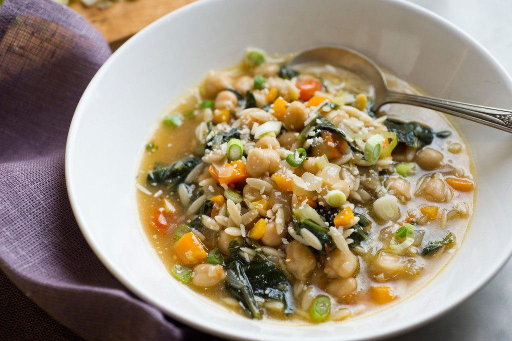 - Once the mixture is boiling, add the chickpeas, tomatoes and orzo. Reduce to a simmer and cover with a lid. Simmer 10 minutes, or until the orzo is tender. Uncover and stir in the greens, letting them simmer until soft, about 2 minutes.