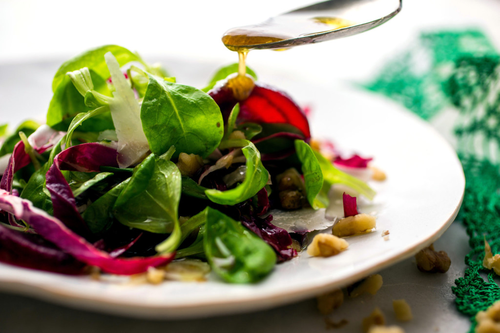 Of all the greens I worked with this week, mâche has the sweetest, mildest flavor. It goes nicely with the bitter radicchio, sweet beets and the nutty vinaigrette. Mâche is so delicate that it takes very little dressing.