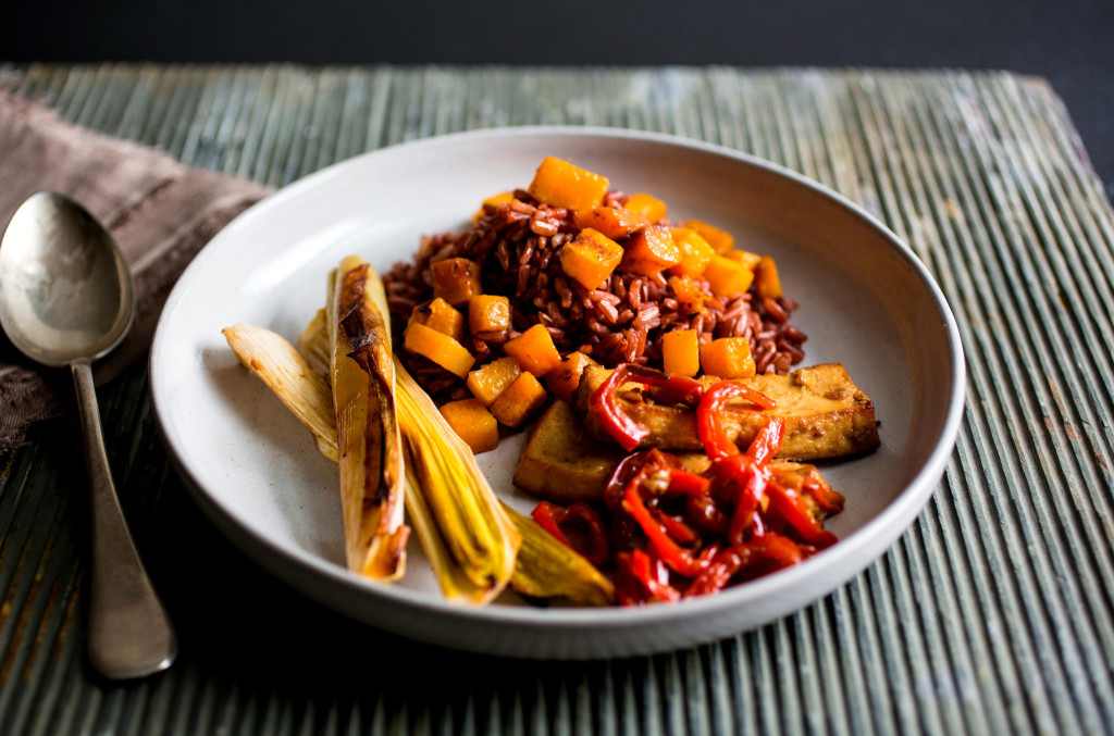 Tofu, red peppers, leeks and winter squash all benefit from the same sweet/salty marinade in this dish. The squash sweetens as it roasts and is irresistible. I recommend that you roast more than the recipe calls for because it makes a delicious snack. The vegetables look pretty against a tawny grain like red rice or farro.