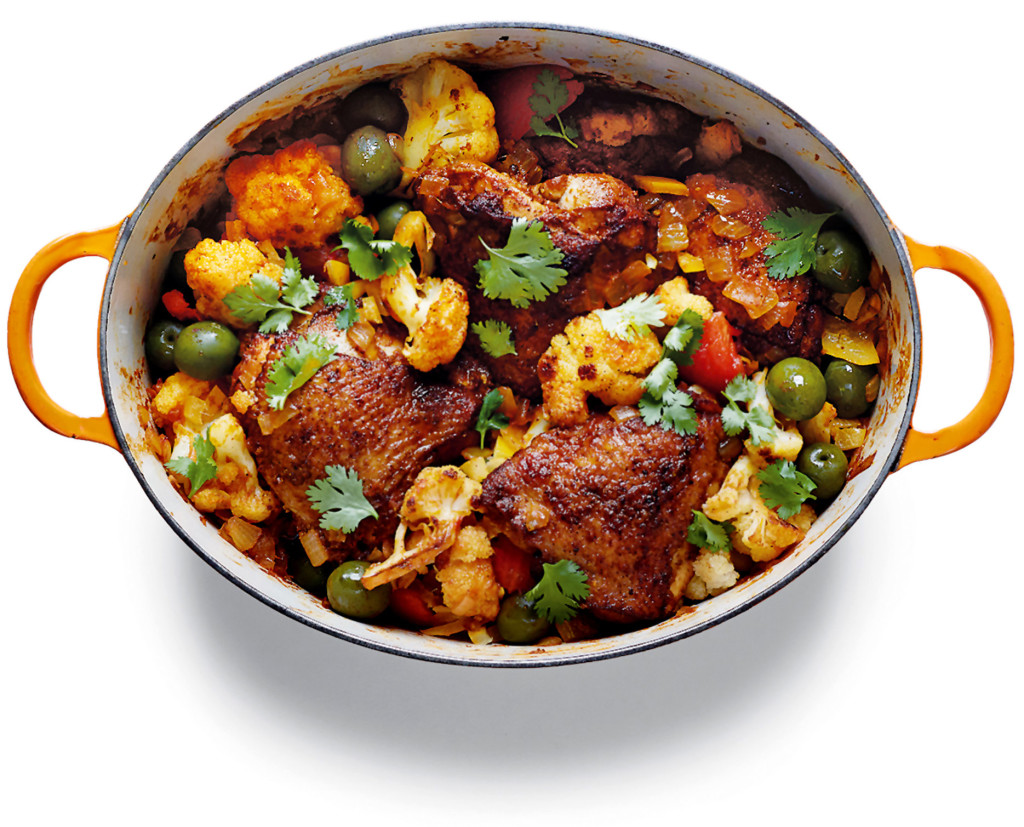- Pour sauce over the chicken and cauliflower, cover the pot and transfer to oven for 20 minutes. Remove, stir in the tomatoes, preserved lemon and olives, then cover the pot again and cook for an additional 20 minutes or until the chicken is cooked through. Serve the chicken in the pot, garnished with the cilantro leaves, with couscous. Reserve remaining spice mix for the next batch or another use. It keeps well in a sealed container.