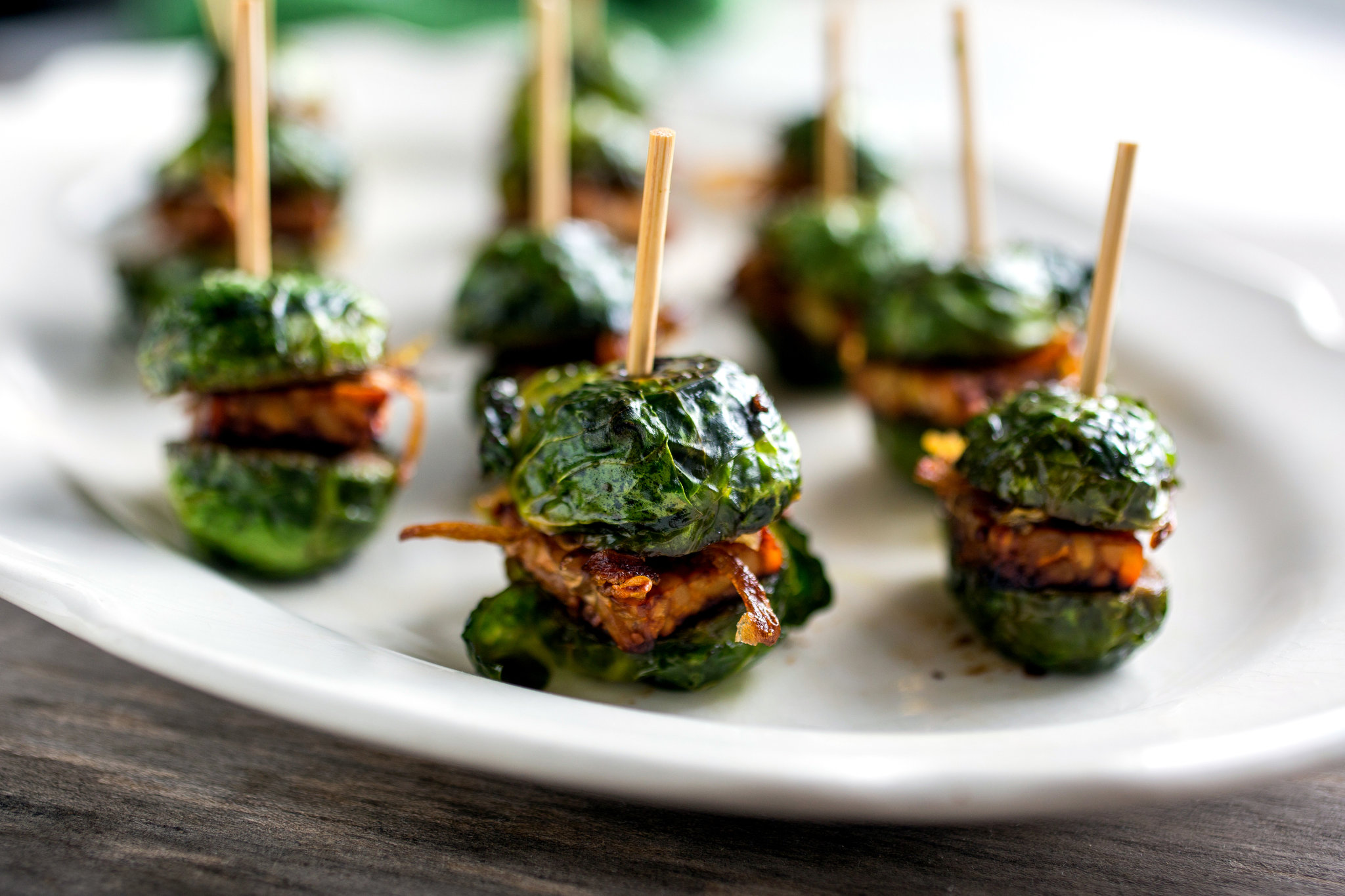 6. Take one half of a brussels sprout, smear with mustard, add a piece of tempeh cut to fit the size of the sprout, add some onions (I used a melon baller for this). Take the other half of the brussels sprout and position it so the two spouts are like the buns on a burger, with the cut sides facing each other, and secure with a toothpick.