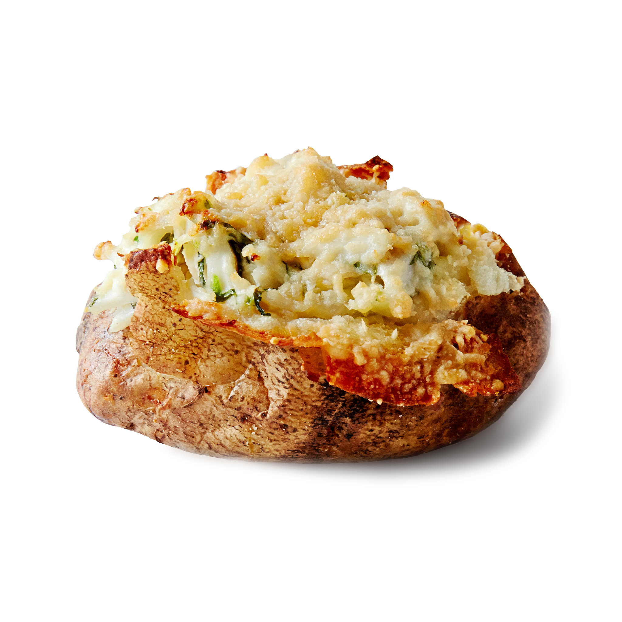 5. When the potatoes are done, remove them from the oven, slice them open down the middle and use a spoon to scrape out their flesh into a bowl. Add the butter, salt and pepper and mash to combine. Spoon the mixture back into the empty jackets, place on a baking sheet, top with the crab-meat mixture and shower with cheese. Return to the oven for approximately 15 minutes, until the cheese is melted and golden.