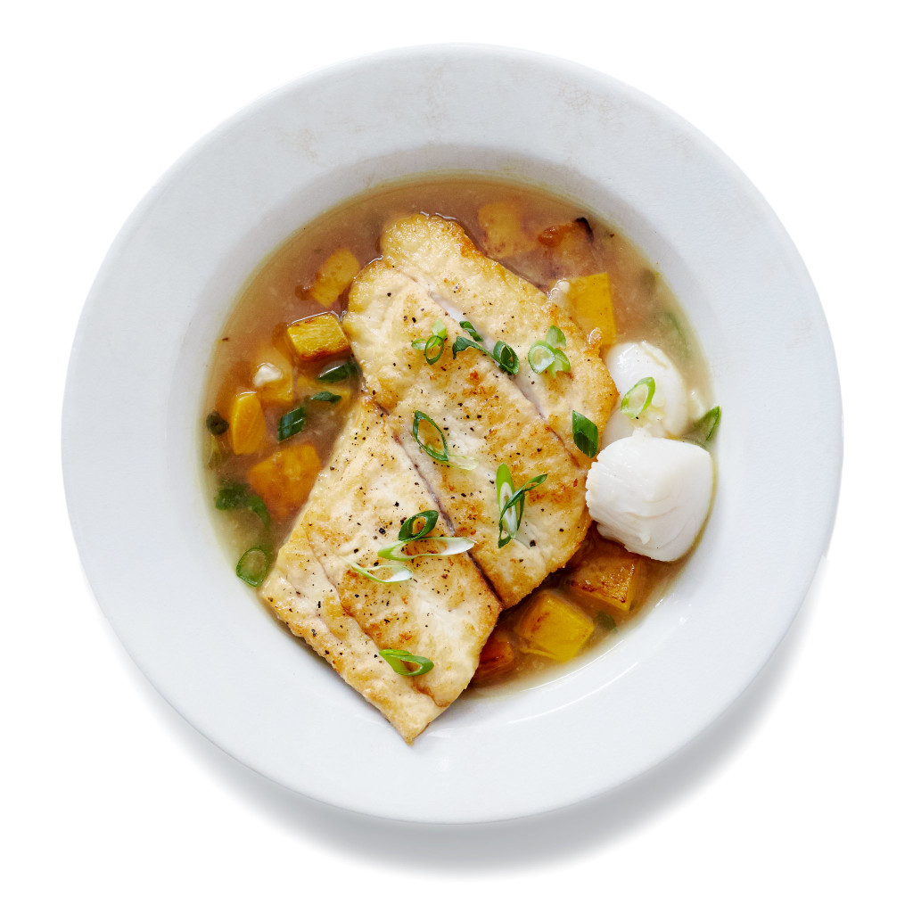 - Assemble the dishes. To the scallops add 1/4 of the squash and equal amounts of brodetto, and top with a fluke fillet. Sprinkle with the scallions, and serve immediately.