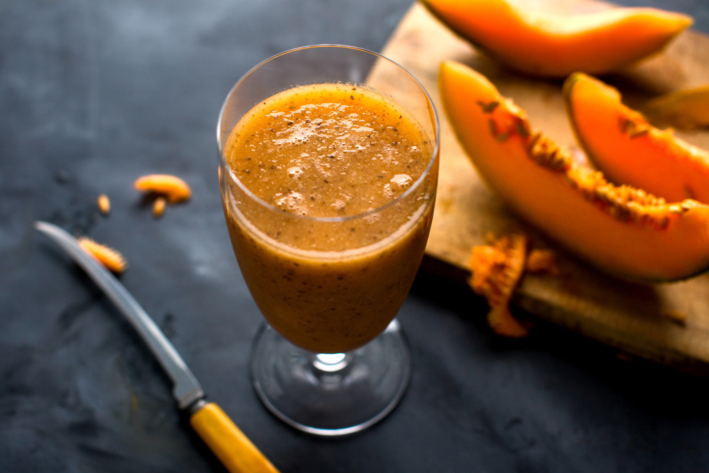 Although I make this in a blender, I think it qualifies as an agua fresca rather than a smoothie, as it is made with pure fruit, enriched with a spoonful of soaked chia seeds. The flavor of the drink will only be as good as your melon, so seek out the best cantaloupe, or other sweet orange melon, you can find. I don’t add sweetener to the drink, but you can if you think it needs a little something.