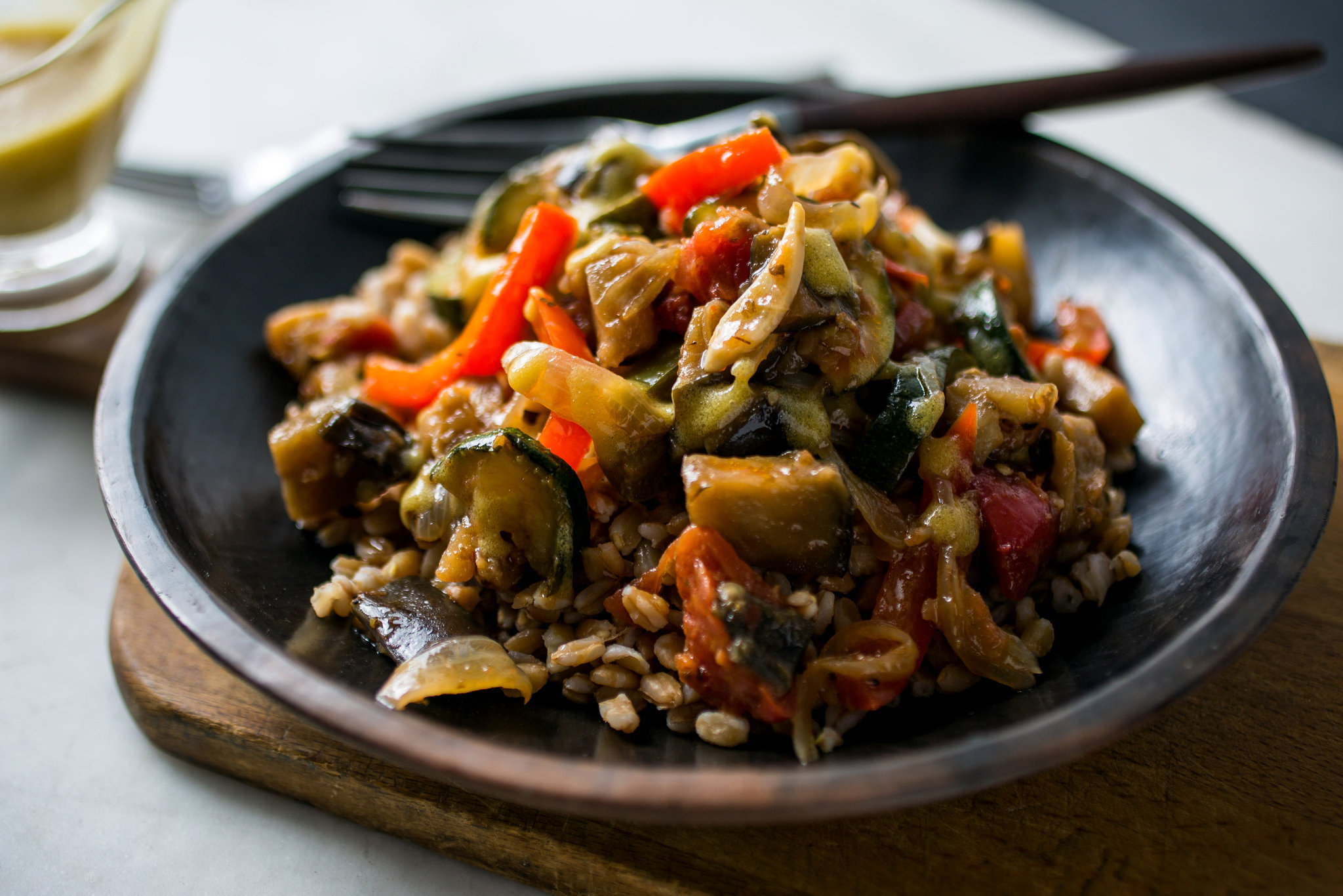 Ratatouille tastes best the day after you make it, and in the summer, I like to serve it chilled or at room temperature, with a vinaigrette drizzled over the top. Here I turn it into a meal with farro at the base of a summer big bowl. You can top the ratatouille with a poached egg, or simply with crumbled feta or grated Parmesan.