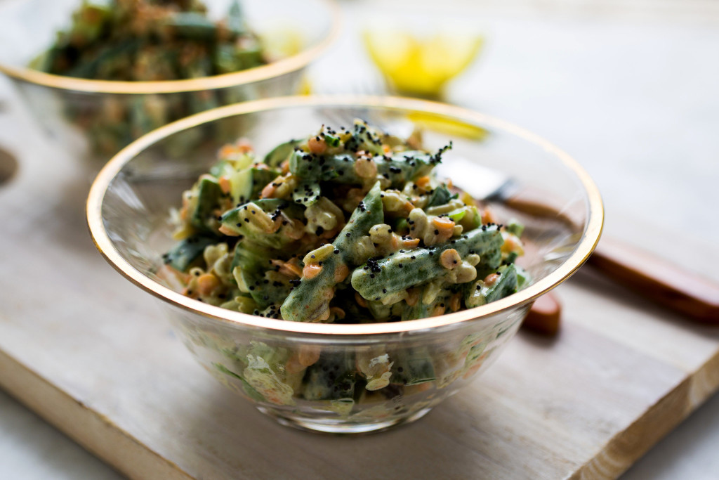 I’ve been making iterations of this hearty whole grain salad tossed with a creamy, curry-spiced dressing since my earliest days of vegetarian cooking. My choice of grains for this version was a function of what I found in my pantry and my refrigerator: — enough brown rice and barley to combine for a salad but not enough for a more substantial dish. Farro or spelt would also work. The split red lentils, soaked just long enough to soften and begin to sprout, contribute color and texture along with their grassy flavor. Tossing the grains with lemon juice while they’re still warm intensifies the flavors in the salad.