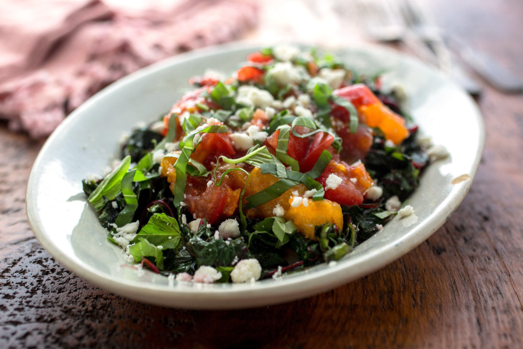 Sweet, juicy heirloom tomatoes can be made into a concassé that works as well with vegetables as it does with pasta or grains. Sometimes, I can’t bear to cook sweet heirloom tomatoes. I love this concassé with pasta or grains, but this time, I decided to use it as a sauce for Swiss chard. I steamed the chard to wilt it, heated it in a little bit of olive oil, then piled it on my plate and spooned the tomato sauce on top. It’s a great combo, and now I think I’ll use it as the vegetable and sauce element of a big bowl. A little feta sprinkled over the top would not be lost on this.
