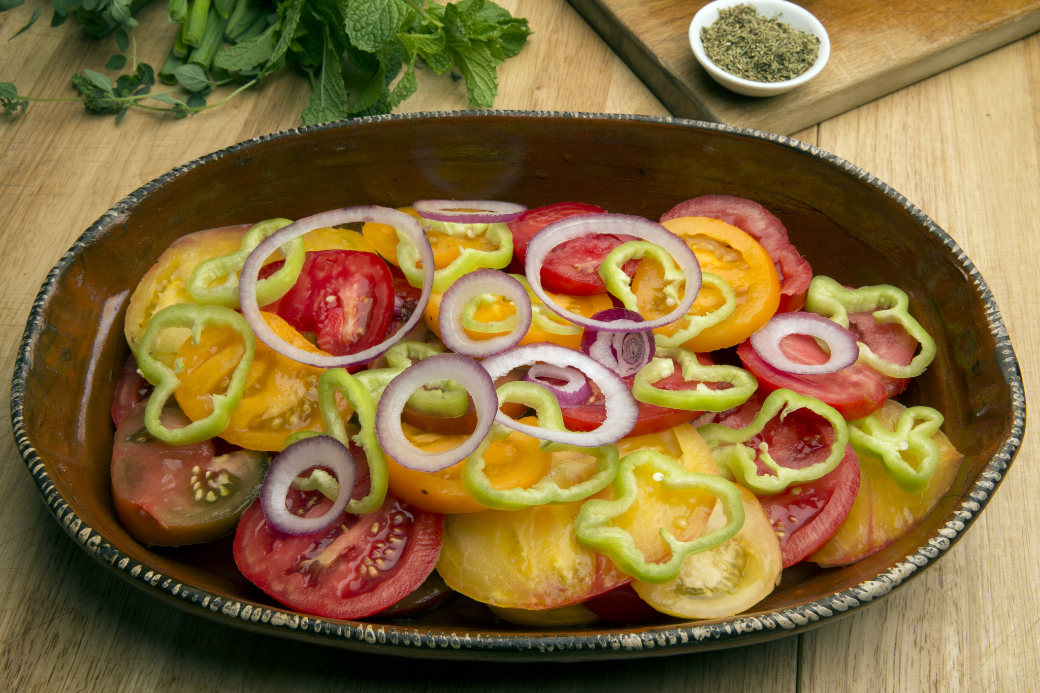 - Scatter onion and pepper slices over tomatoes and season everything with sea salt. Let sit 10 minutes to draw out juices.