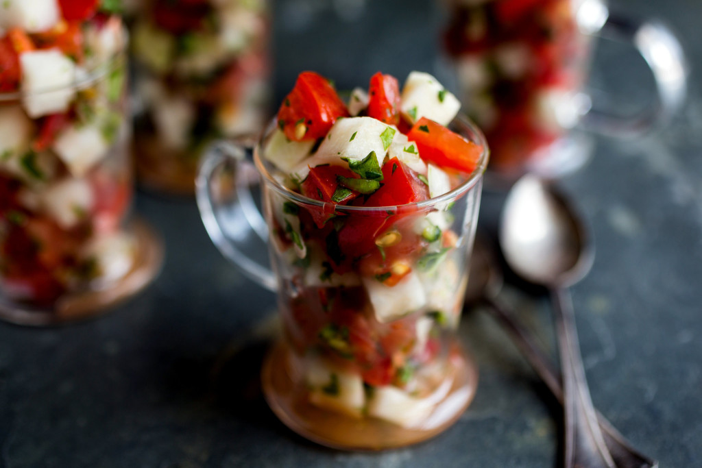 Sweet, juicy watermelon and spicy chiles combine to create a surprising summer salsa with a kick. It goes especially well with grilled fish. Watermelon is a refreshing ingredient to use in a salsa. I’ve combined it with tomatoes and jicama here, and the result is a fruity/vegetal salsa with a kick from chiles, lime and cilantro. Like the other fruit-based salsas I’m featuring this week, I like this with rilled fish, especially light-fleshed fish like halibut or mahi-mahi.