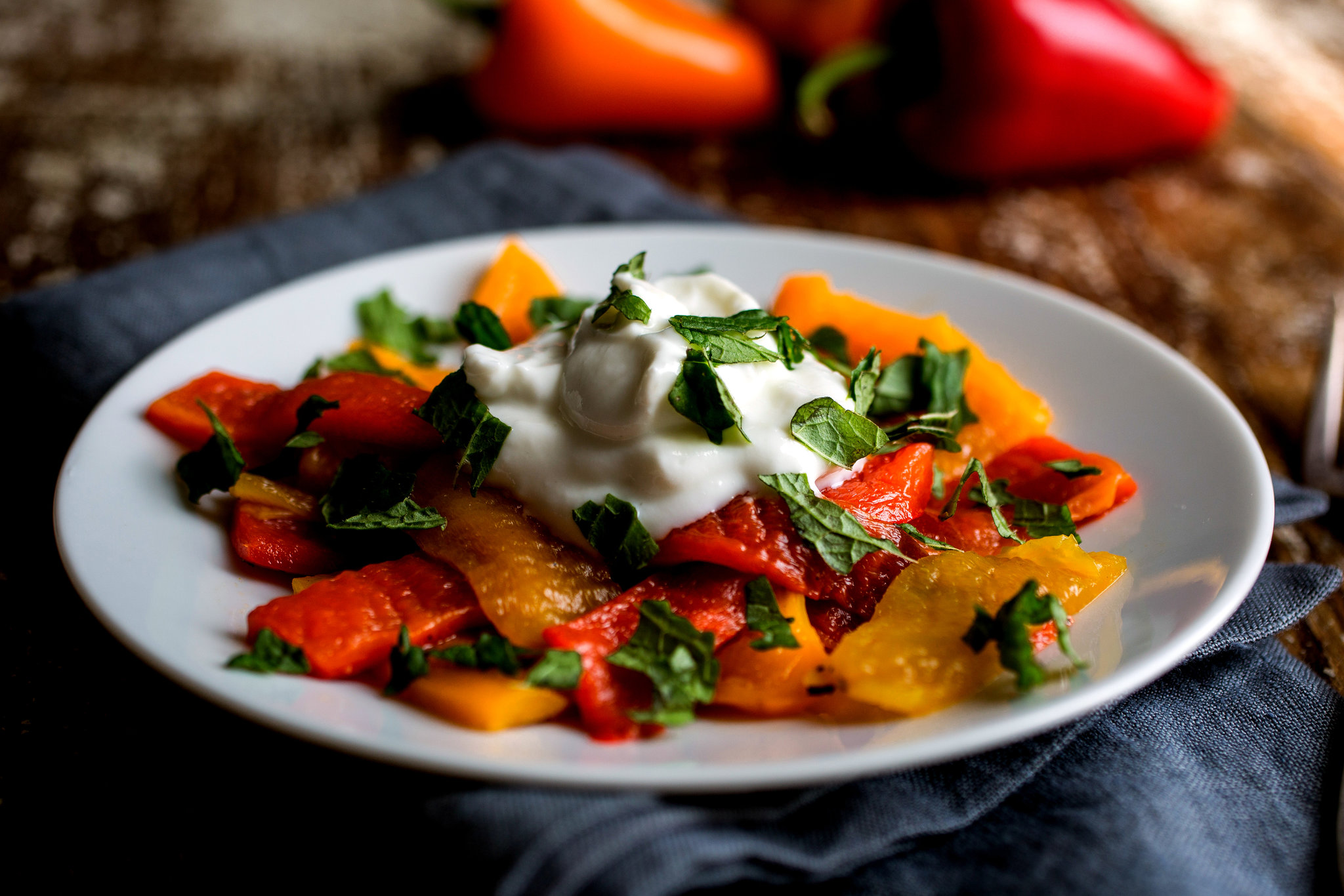- Arrange peppers on a platter or on individual plates. Spoon yogurt on top, drizzle on a little olive oil, garnish with chopped herbs if desired and serve.
