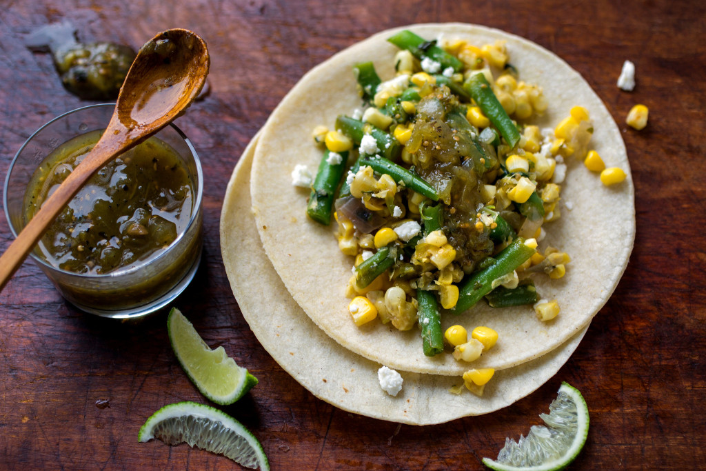 Another way to use the versatile green bean in summer cooking. Cut into one-inch lengths and add to a mix of corn, chiles and green tomatillo salsa. Green beans are such a reliable and versatile summer vegetable. I serve them on their own, of course, but I also throw them into various pasta dishes and salads, and here I’ve used them in a taco filling. Cook the beans first, just until tender, then cut them into one-inch lengths and add to this sweet and spicy mix of corn, chiles and green tomatillo salsa.