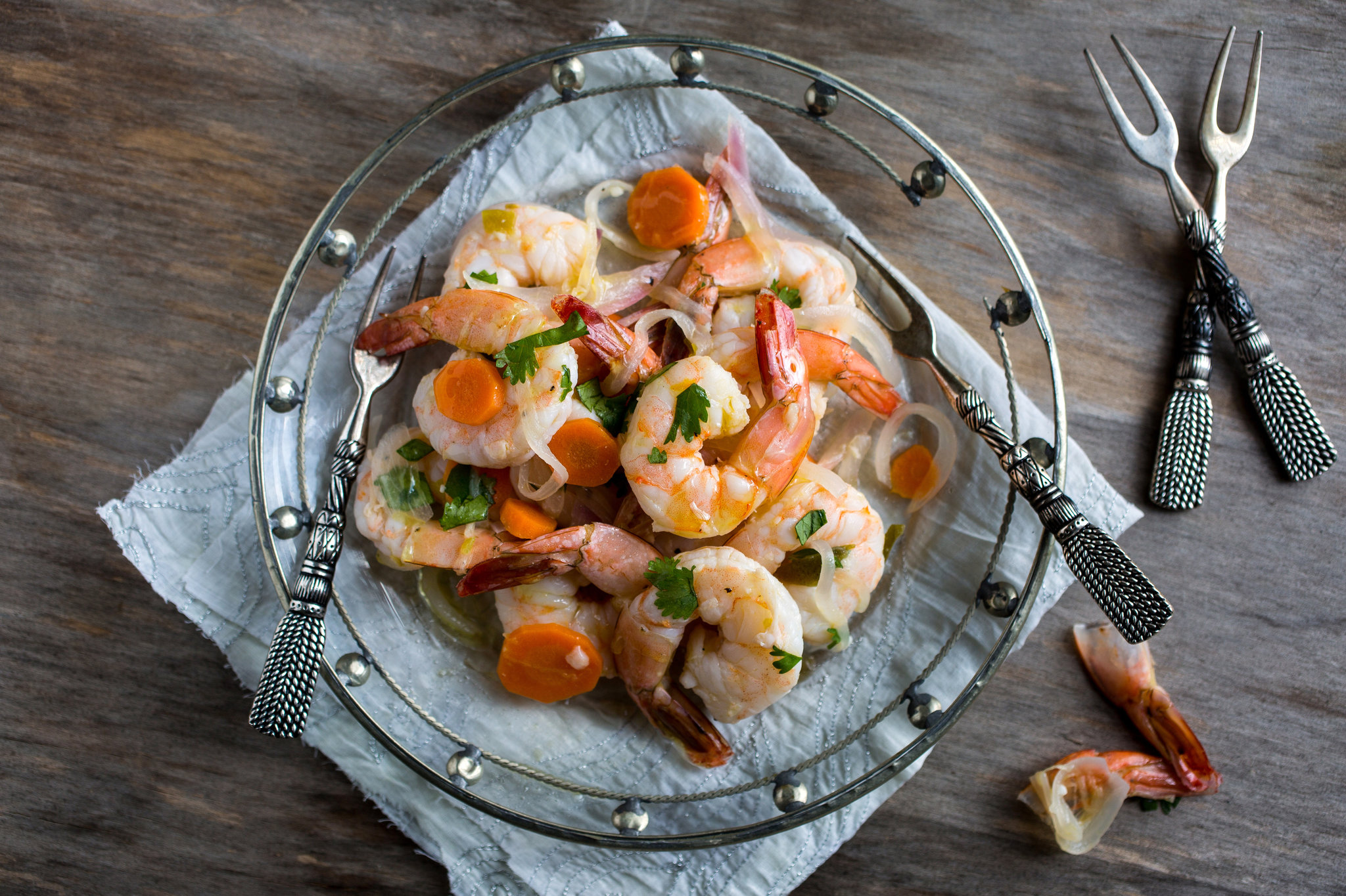 - Add chiles, bay leaves, vinegar, pepper, ground cloves, salt to taste and 1/2 cup shrimp stock and bring to a simmer. Reduce heat to low and simmer for 5 minutes or until the shrimp is cooked through, stirring occasionally. Remove from heat and transfer mix to a bowl. Refrigerate for 30 minutes or longer.