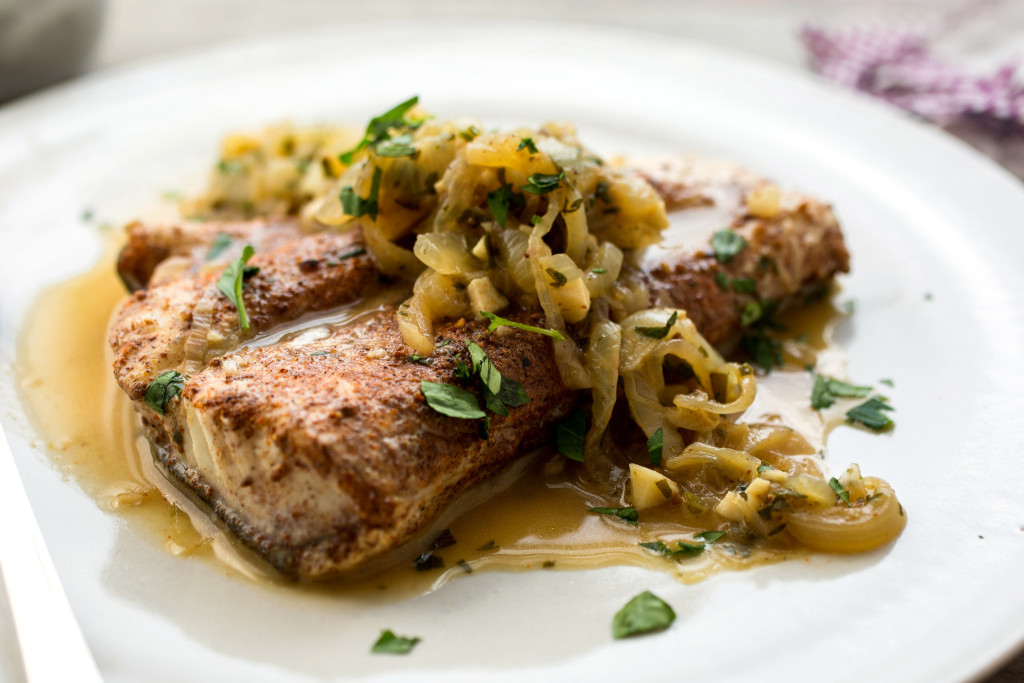 - Heat the oil over medium heat in a large skillet or pot that can accommodate the fish in one layer (if you don’t have a wide enough pan, fold the fillets in half or poach the fish in batches.) Add onions to the pan and cook, stirring often, until they soften, about 5 minutes. Add a generous pinch of salt and the garlic and continue to cook, stirring often, until onions are very soft, another 3 to 5 minutes. Set fish fillets, whether flat or folded, on top of onions and pour in the court-bouillon. It should just cover the fish. Add water or additional court-bouillon as necessary.