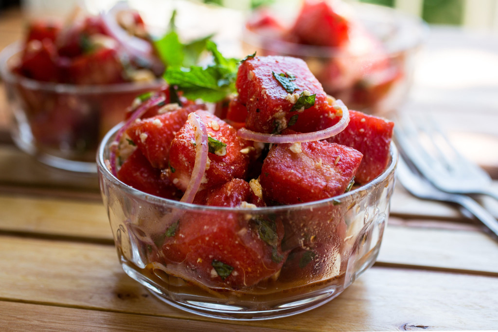 I love watermelon and feta salad, whether the watermelon is grilled or not. The sweet, juicy watermelon against the salty, creamy feta and pungent onions is a winning combination. This version introduces heat — if you serve it right after grilling the melon (it isn’t a must) — and char. Throw the watermelon slices, with the rind, onto the grill after or before you’ve grilled your meat or fish or vegetables. Grill them on both sides until just charred, then cut away the rinds and dice up the melon for the salad.