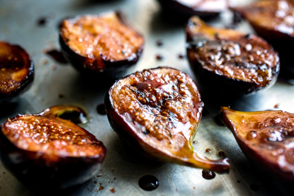 - Remove to a platter or sheet pan and brush each fig on the cut side with pomegranate molasses (you don’t need much).